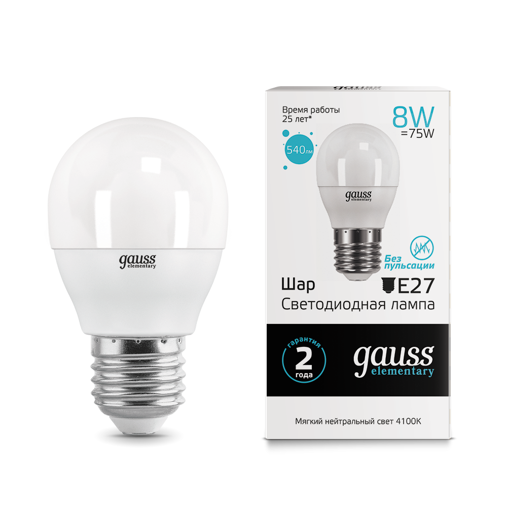 Лампа светодиодная Gauss Elementary Е14 G45 8W 4100K шар 53228 в Якутске
